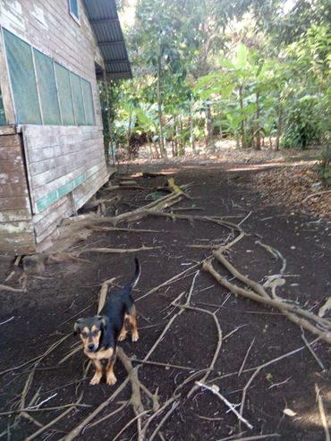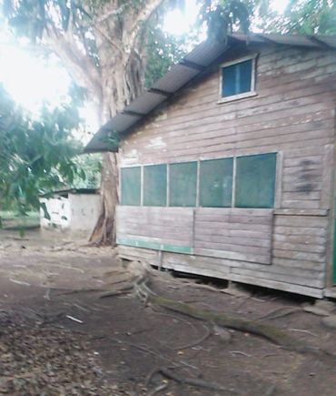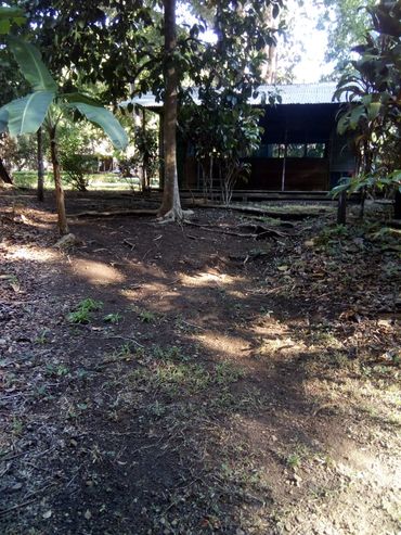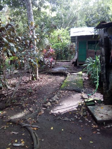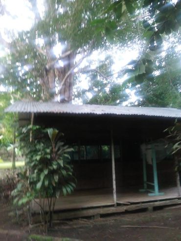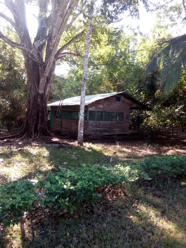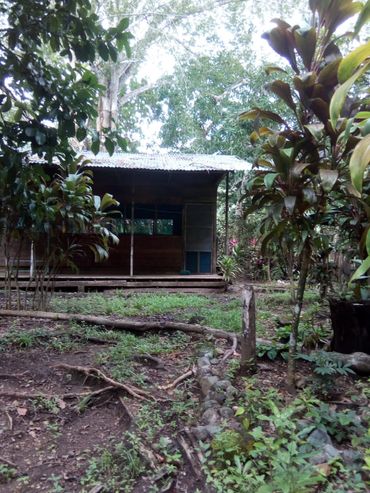 La cabaña es una gran habitación abierta, con dos puertas principales y una trasera. Tiene un amplio porche cubierto. Hay mosquiteras por todas partes y persianas para pasar largos periodos fuera.